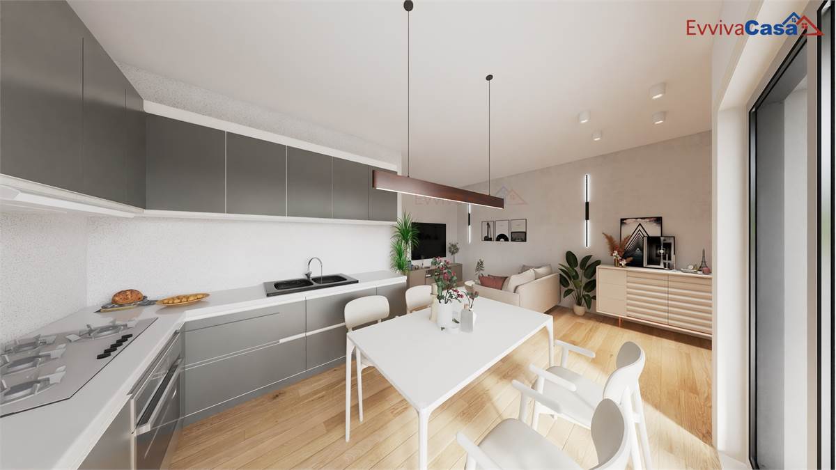 L’ingresso si apre su un soggiorno luminoso con cucina a vista, collegato direttamente alla terrazza di 22 mq, ideale per pranzi e cene all’aperto.