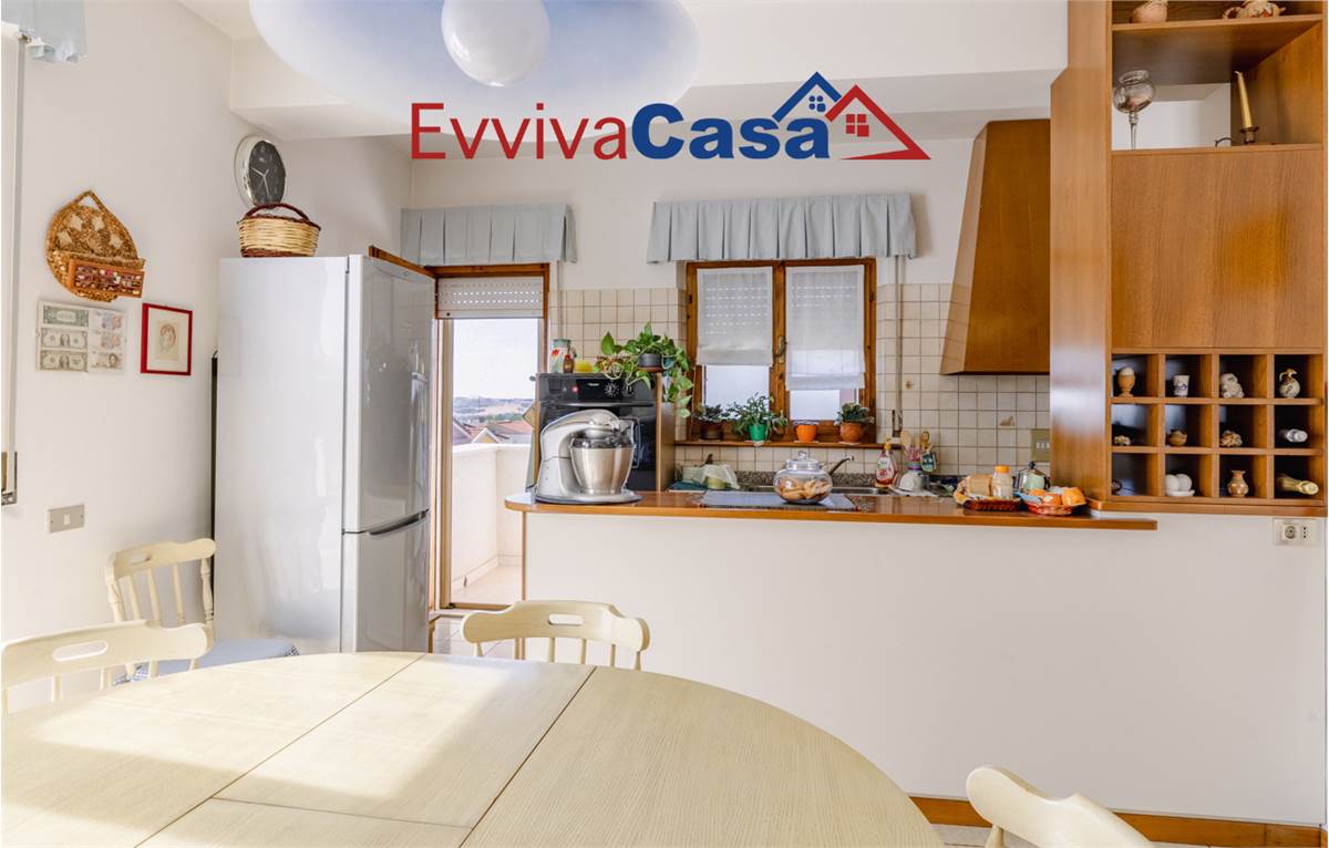 Entrando sulla destra troviamo l'ampia cucina, estremamente luminosa grazie ai due balconi, un ambiente perfetto per riunire tutta la famiglia in pieno comfort e praticità; accanto, un salone spazioso con un balcone a forma di L che garantisce luce naturale tutto il giorno.