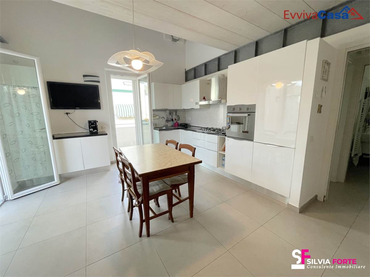 Dalla terrazza entri direttamente nel soggiorno con cucina a vista, luminoso e accogliente, con accesso sia alla terrazza che a un balcone.